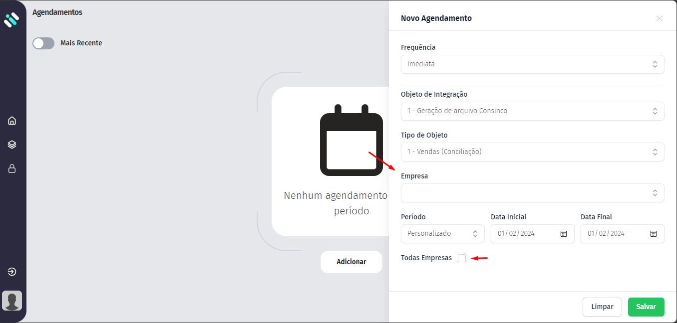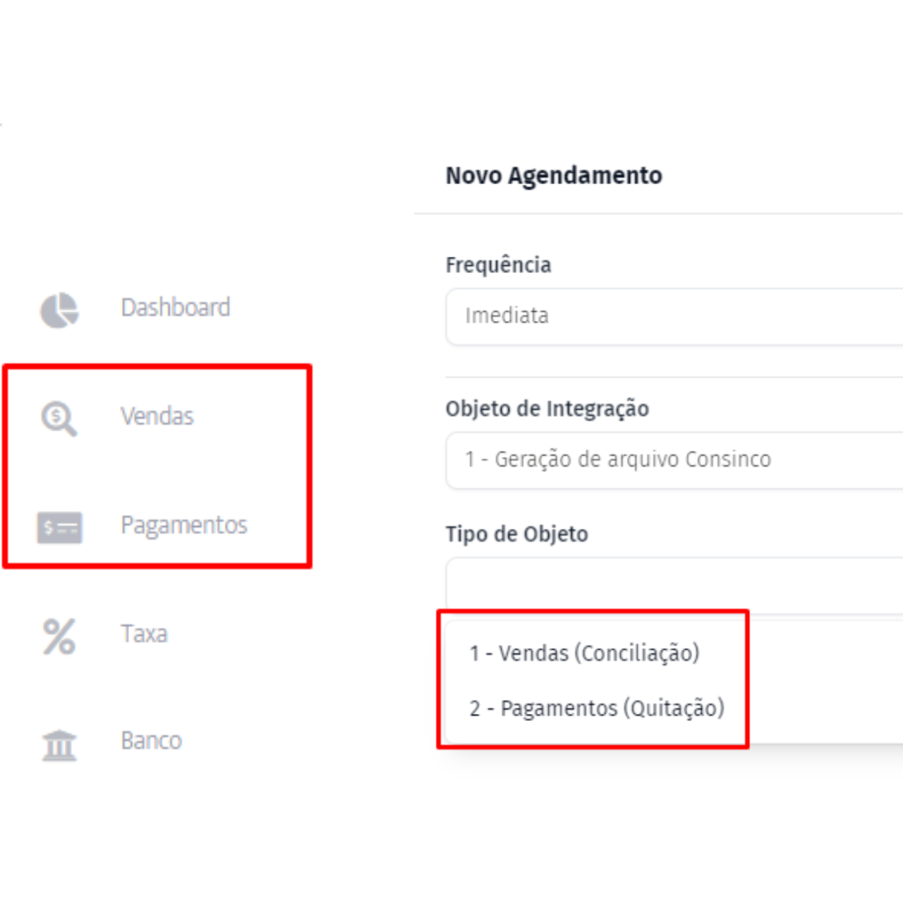 Selecione o tipo de objeto (vendas para conciliação e pagamentos para quitação, para mais informações acesse esse link);