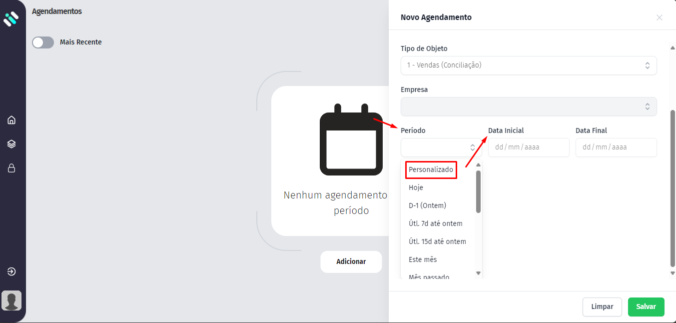 Selecione o período da venda/pagamento (para inserir uma data específica, clique em Personalizado e selecione a data inicial e data final);