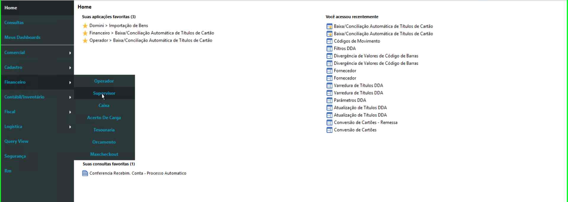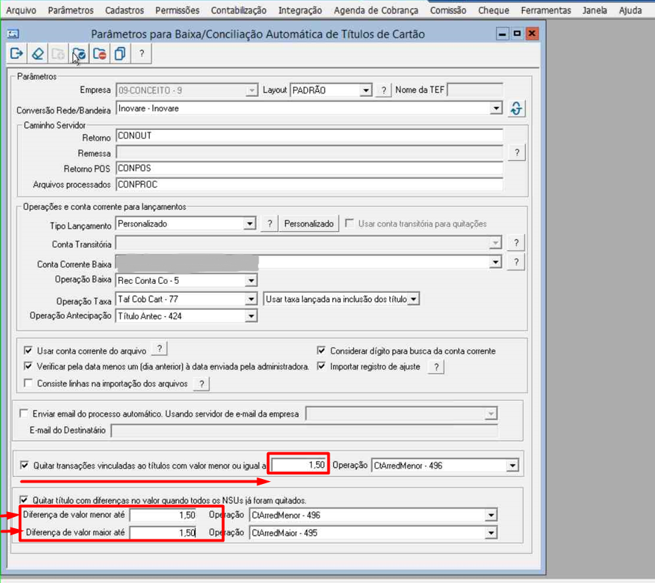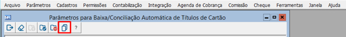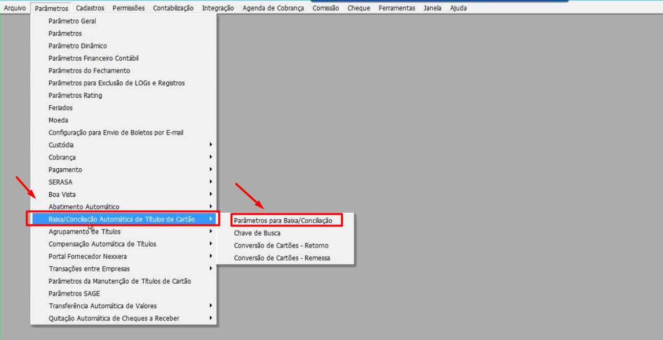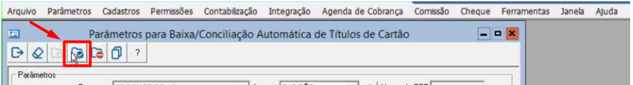 Etapa 3: clicar em Baixa/conciliação Automática de Títulos de cartão > Parâmetros para Baixa conciliação